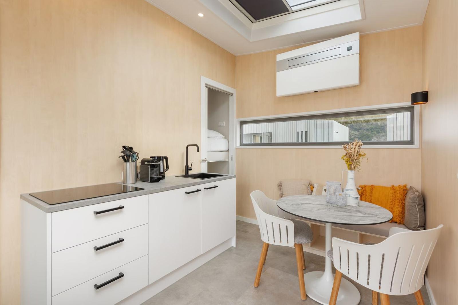 Our Beach Houses accommodate up to four people and are cleverly and comfortably furnished. The bright living room features a cozy sitting area and an open-plan kitchen, equipped with a refrigerator-freezer, coffee pod machine, and kettle. From the living room, you step directly onto the veranda: a wonderful place to start the day with a cup of coffee, soak up the sun, or chat together in the evening while listening to the sea in the background.